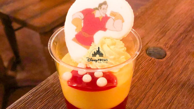 こちらは、力自慢のガストンをイメージしたカップデザート。カップの中に、ストロベリーゼリー&マンゴームース、上に甘酸っぱいラズベリーソースがかかったデザートです。